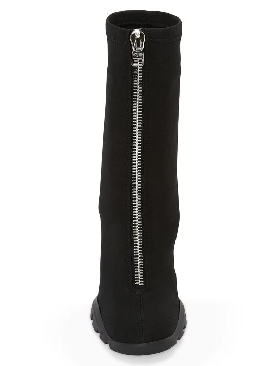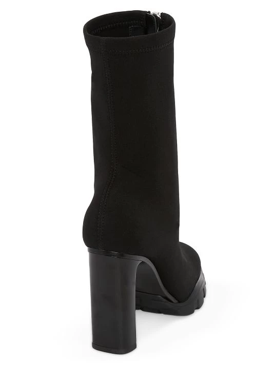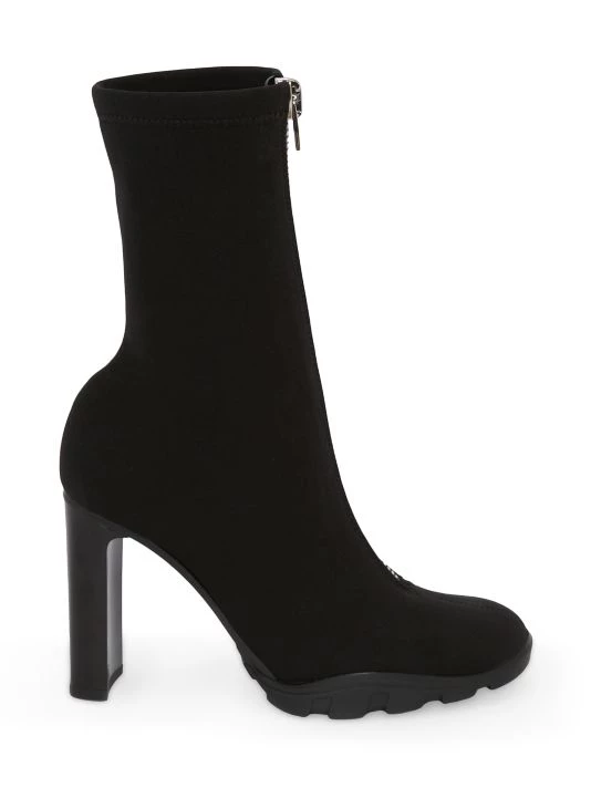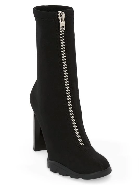 Crafted of durable neoprene, these block-heel booties are finished with a zip closure at vamp.