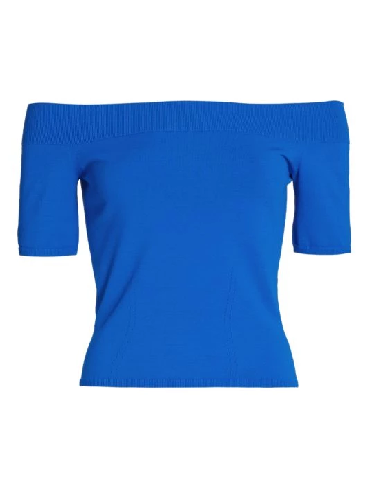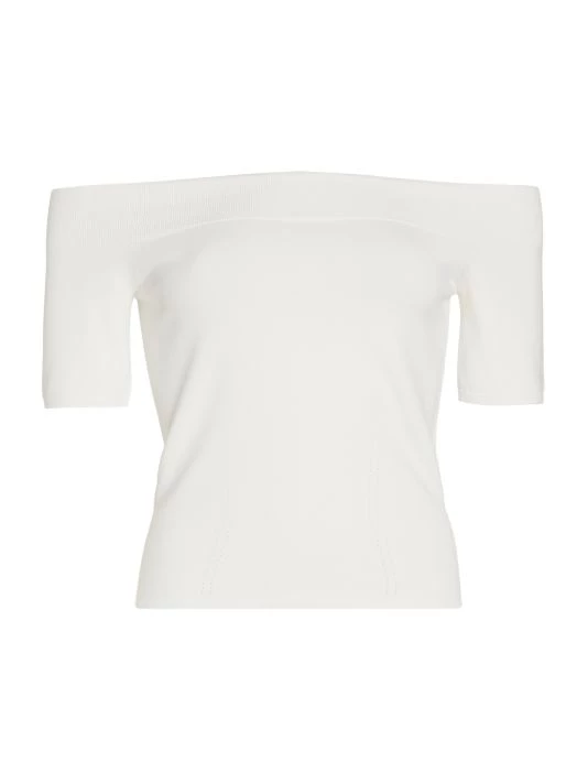 A shoulder-baring off-the-shoulder neckline defines this short sleeve top.