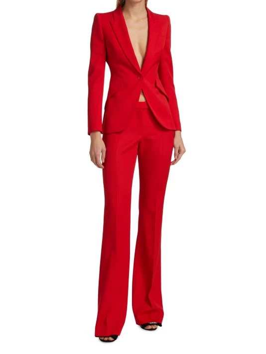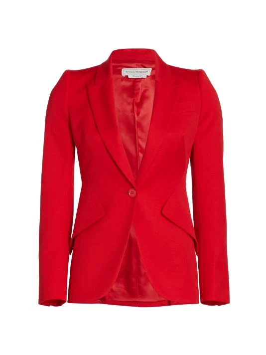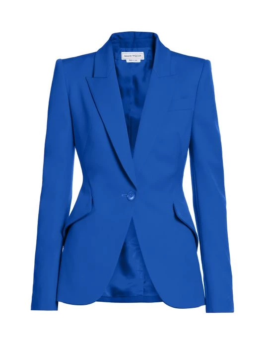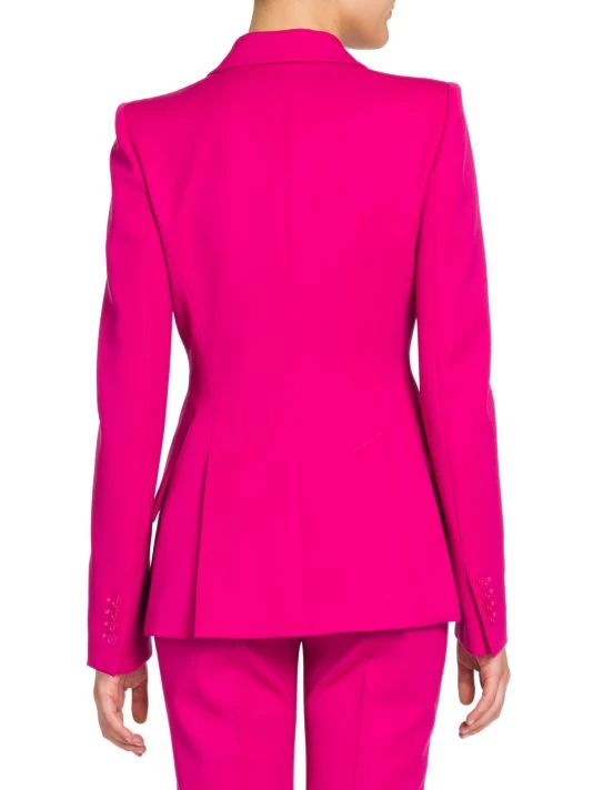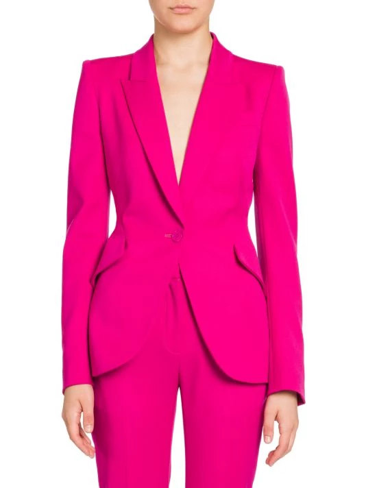 A vibrant jewel-tone blazer with a sharply tailored fit and sleek angled pockets.