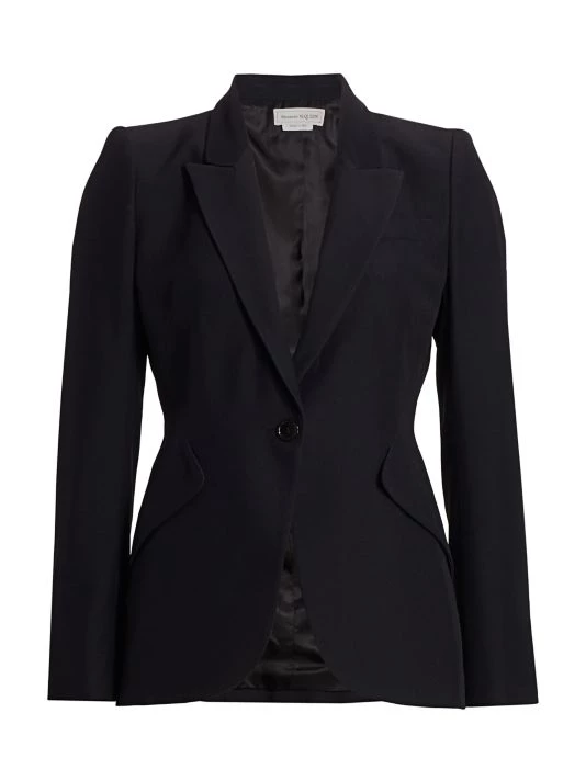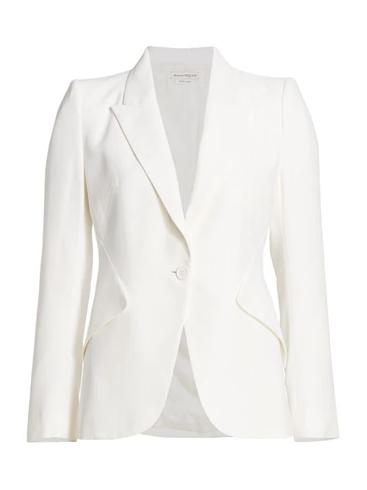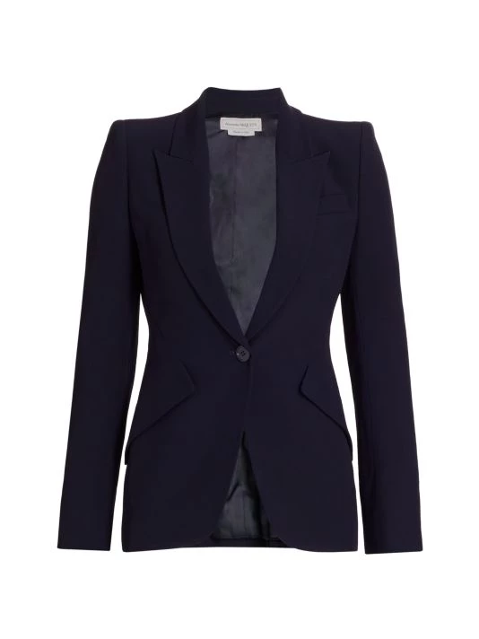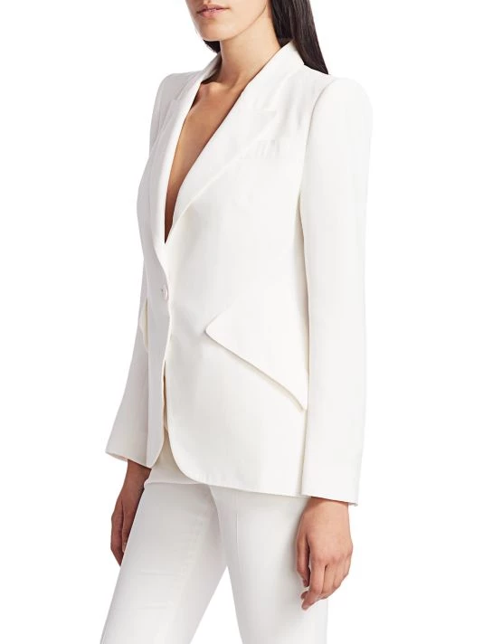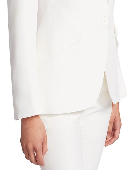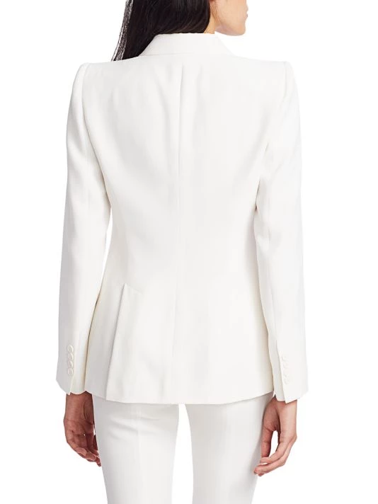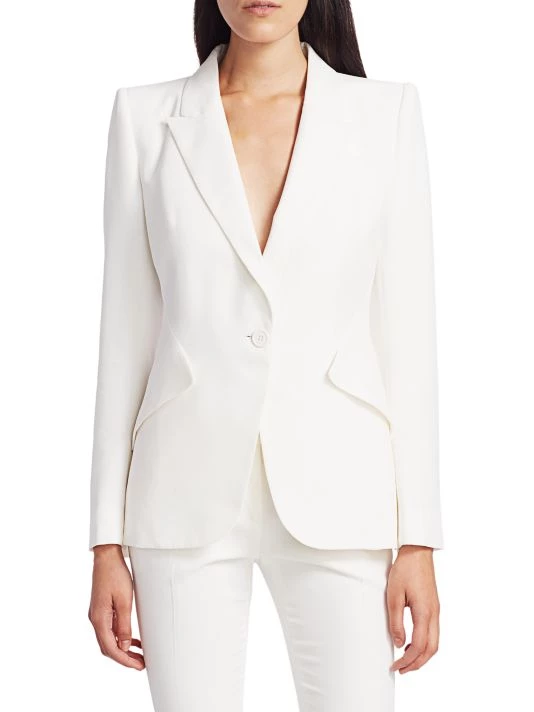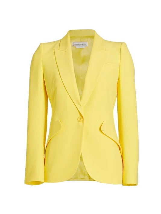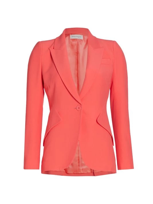 Impeccable tailoring is a signature of the house. Here, this sugary pink blazer is cut with a strict shoulder line, peak lapels and curving peplum-like panels at the waist for a silhouette that is simultaneously hard and soft.