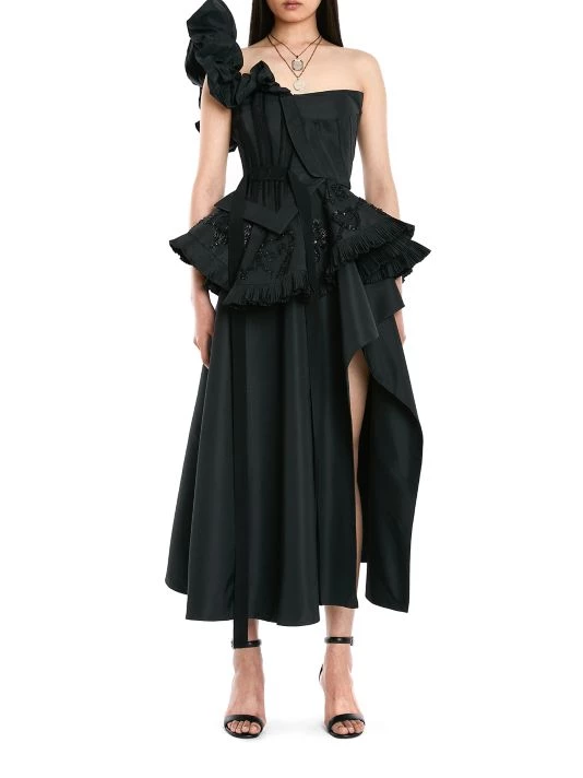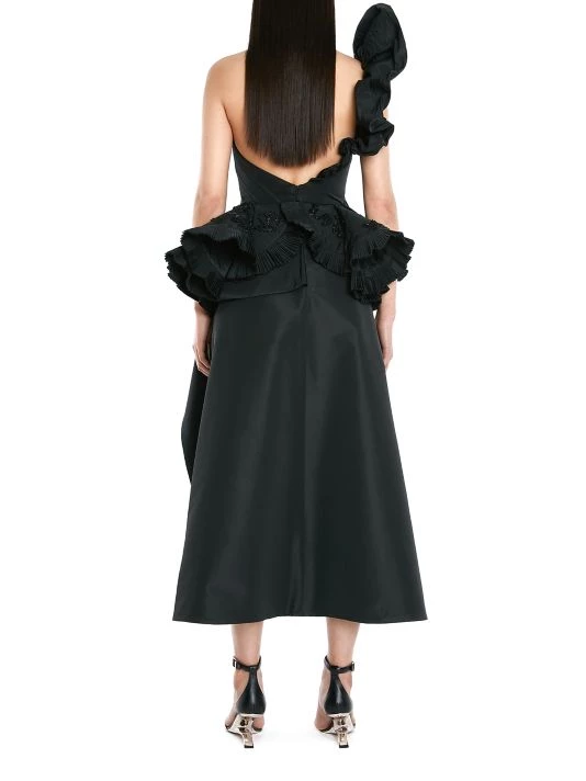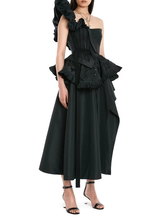 Designed in a one-shoulder style, this Alexander McQueen dress is detailed with layered ruffles and sparkling embellishments at the waistline.