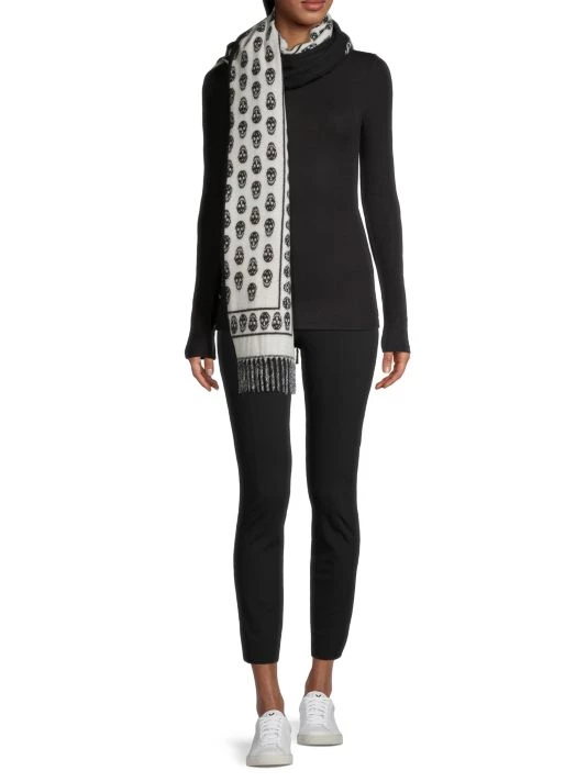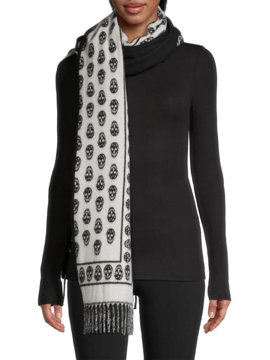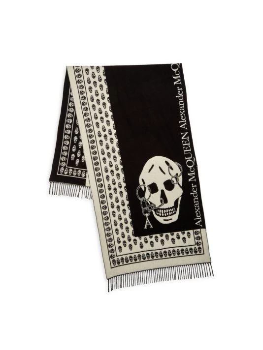 Oversized skull with chain-link piercings define this allover monogram scarf, finished with a fringe trim.