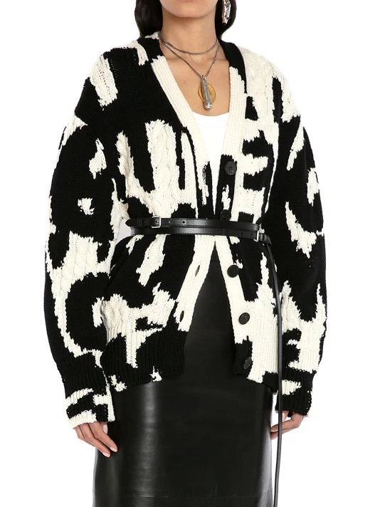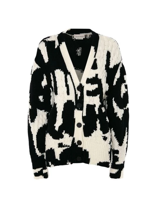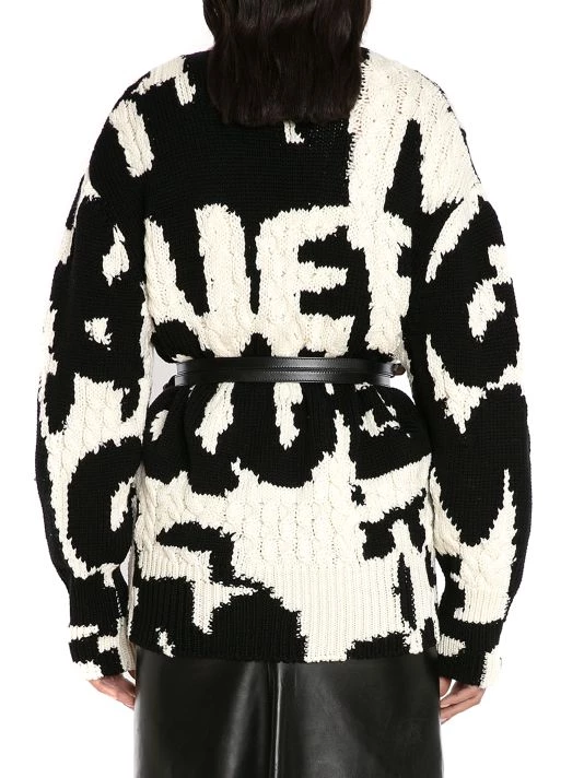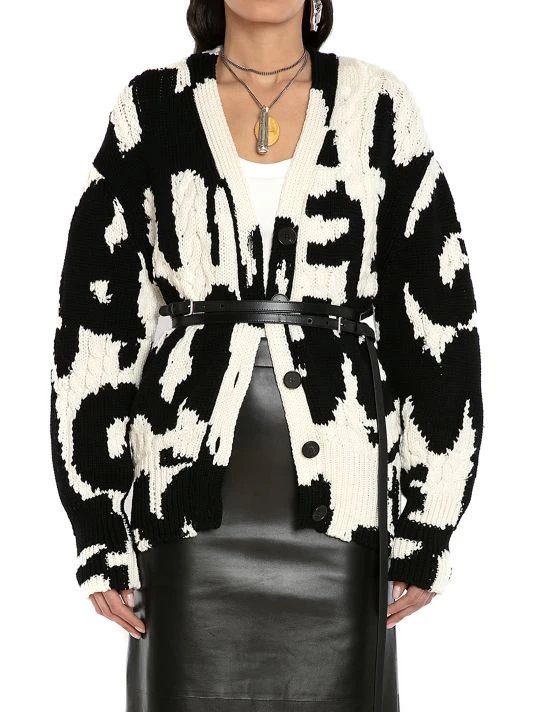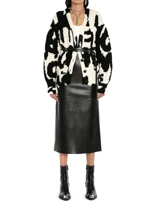 Cut in an oversized silhouette, Alexander McQueen’s cable-knit cardigan boasts large graffiti-inspired branding.