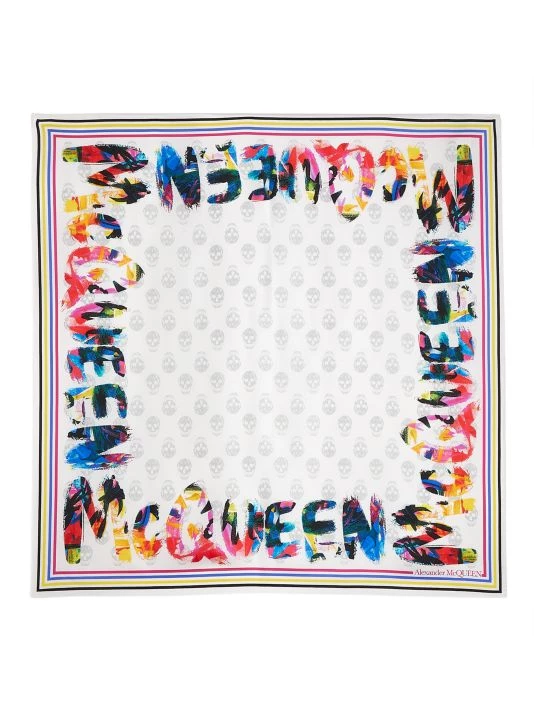 Alexander McQueen’s silk scarf is adorned with painted graffiti logo lettering with a signature skull print.