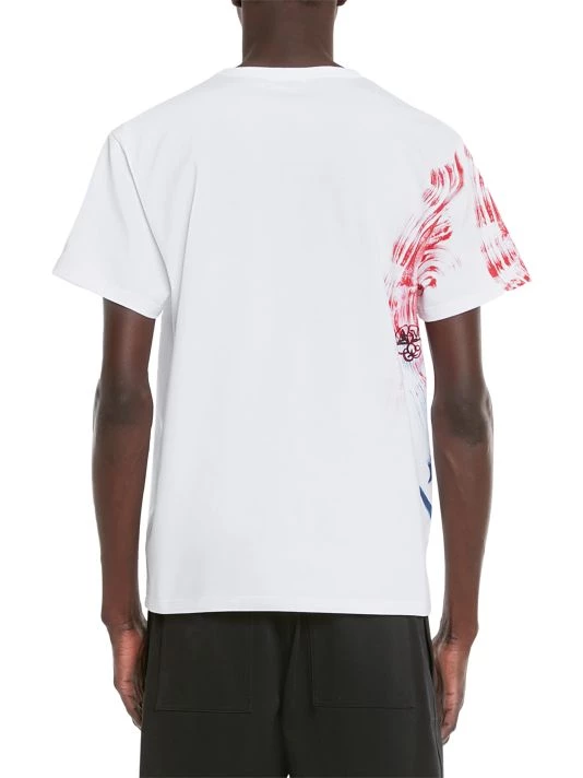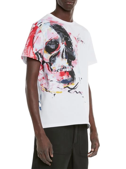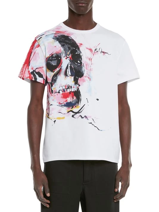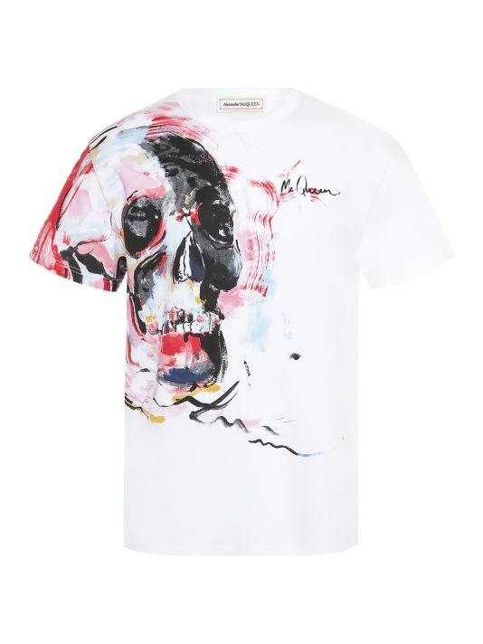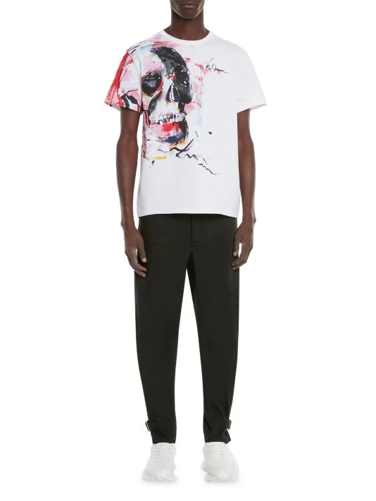 Inspired by London skies, this Alexander McQueen collection features cloud prints on linen, wool, and silk designs. Each piece encompasses casual and formal wear, from structured blazers to crewneck sweatshirts and spiked leather loafers, staying true to the brand’s slim-fit silhouettes. This jersey crewneck T-shirt showcases an enlarged painted skull motif on the front.