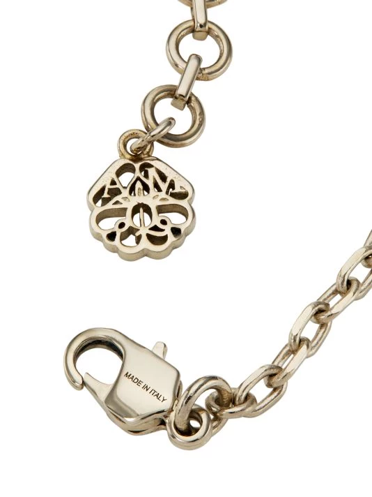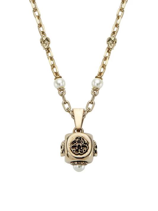 Alexander McQueen’s edgy pale goldtone necklace is full of intricate details. This sculpted style features an embossed dice pendant accented with crystal pearls and skulls along the chain.