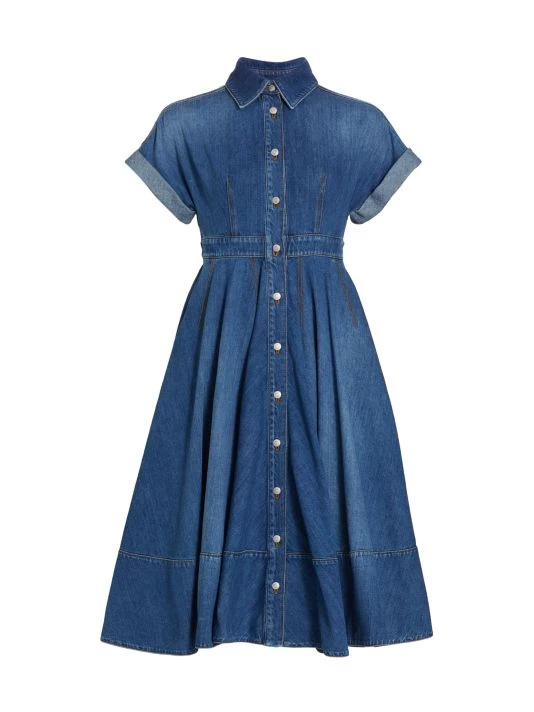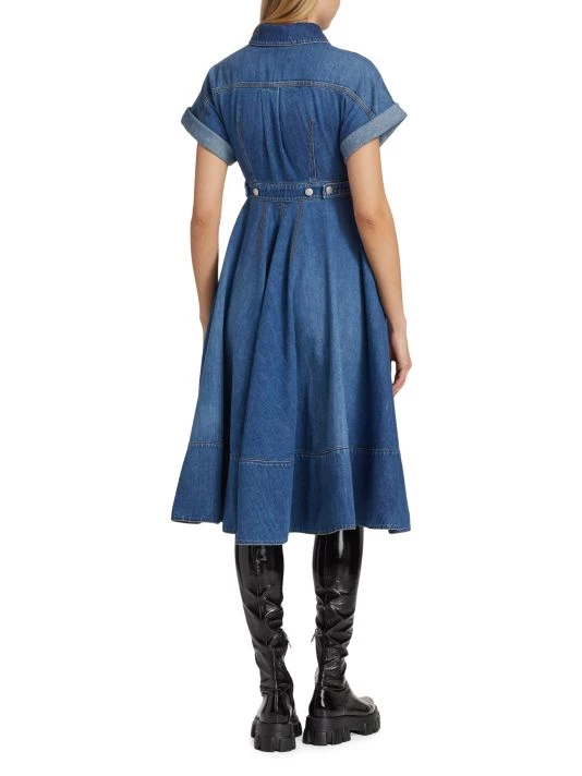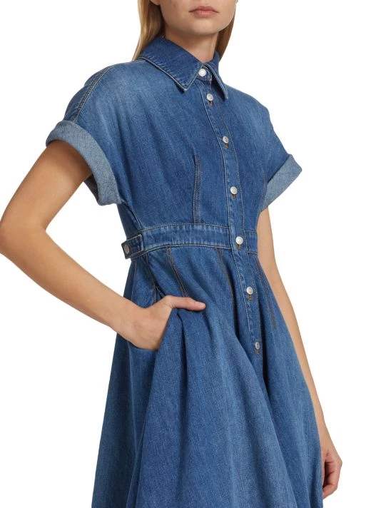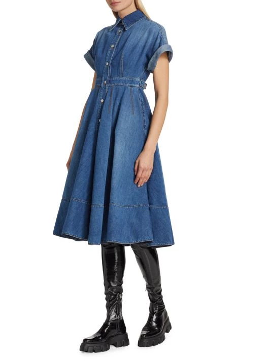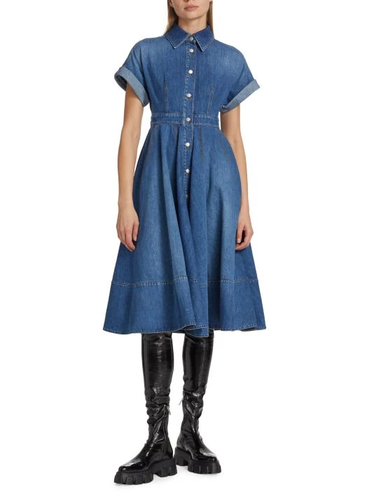 Crafted of denim, Alexander McQueen’s shirtdress boasts a convertible button waist and pleated flared skirt.