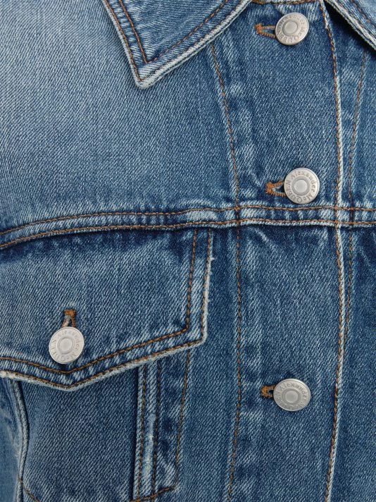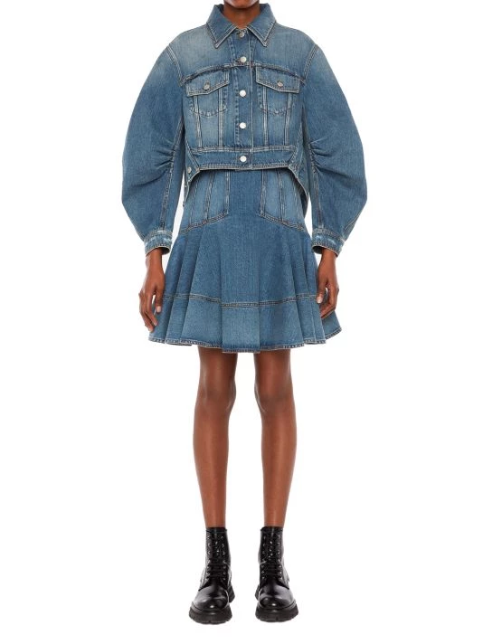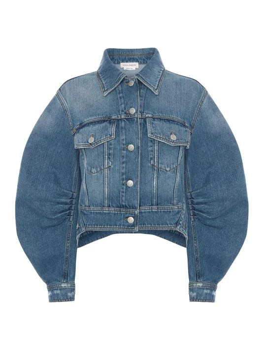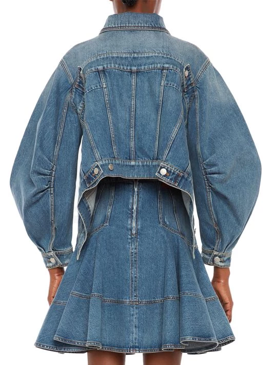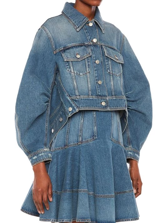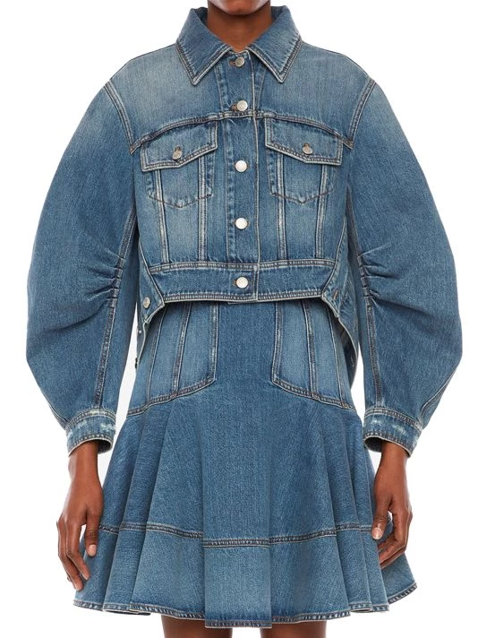 This classic Western denim jacket has voluminous puffed sleeves to offset the cropped boxy cut of this piece. It offers a modern take on a timeless wardrobe staple.