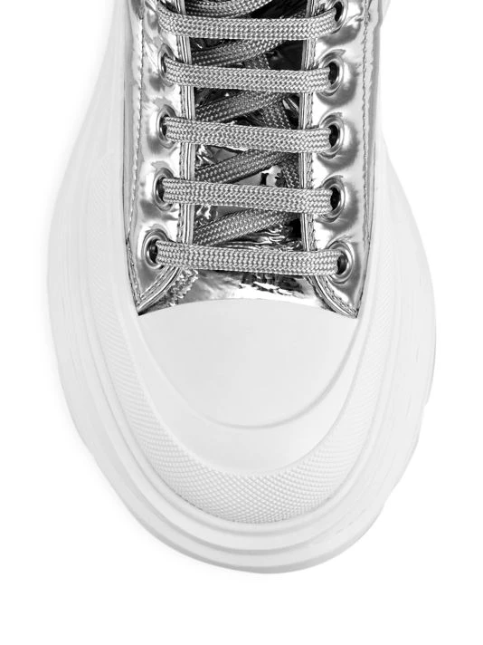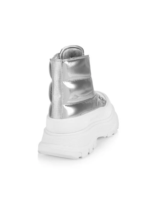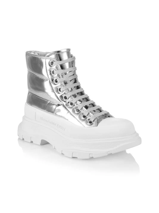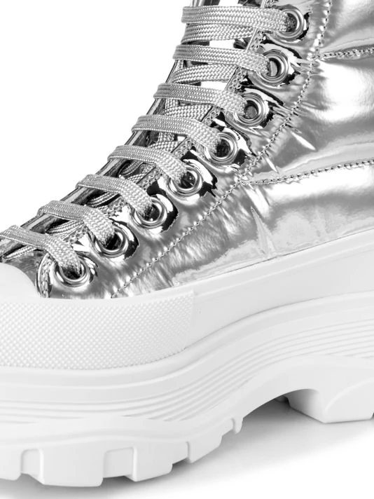 Workwear-inspired sneaker boot elevated with an oversized rubber sole, rendered in a padded metallic leather construction.