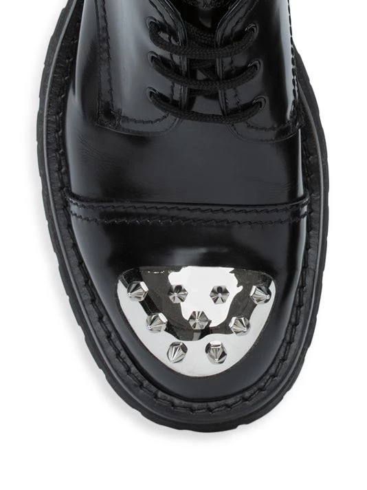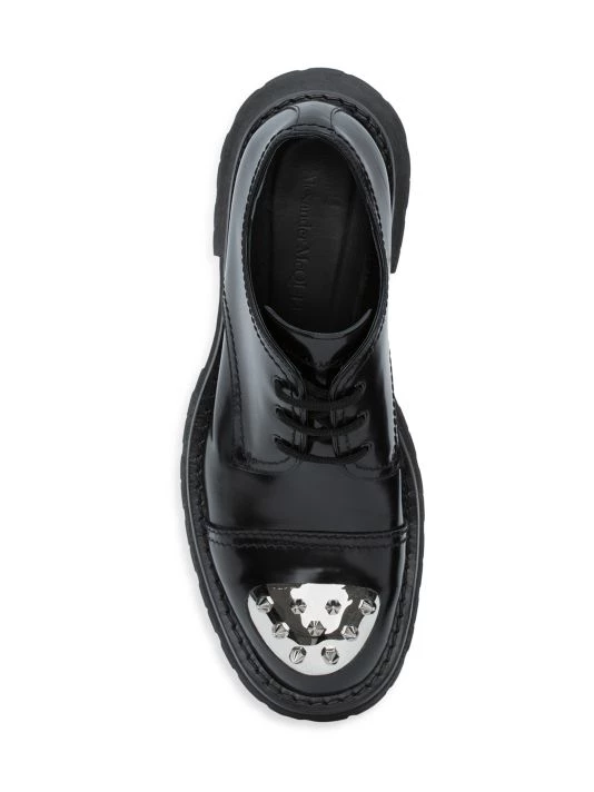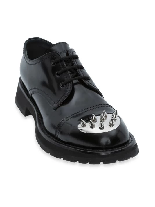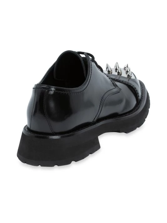 Inspired by London skies, this Alexander McQueen collection features cloud prints on linen, wool, and silk designs. Each piece encompasses casual and formal wear, from structured blazers to crewneck sweatshirts and spiked leather loafers, staying true to the brand’s slim-fit silhouettes.Sculpted on a lug sole, these leather derby shoes are embellished with a studded silver-tone toe cap.