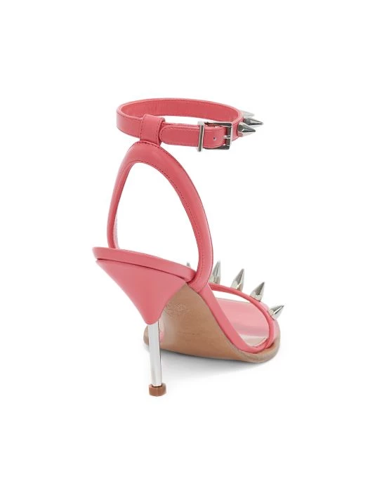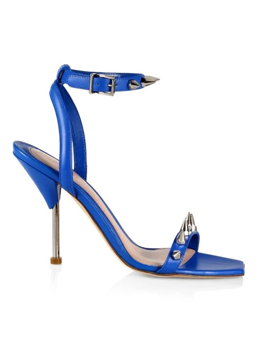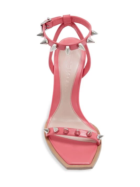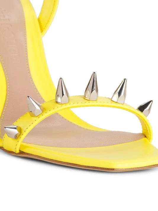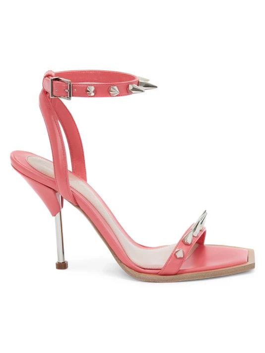 Spike studs adorn the slender leather straps on these edgy sandals, elevated with a contrast stiletto heel.