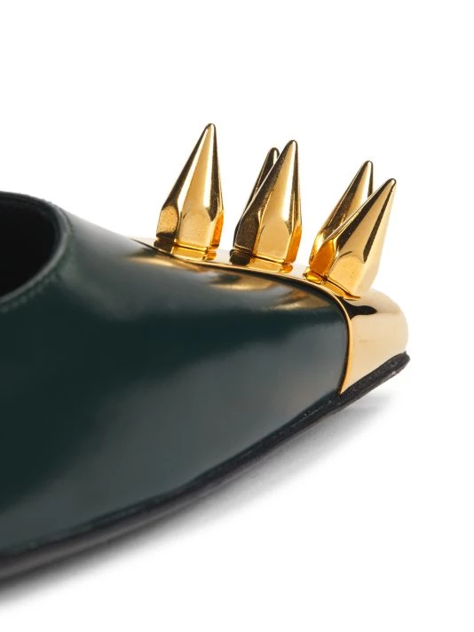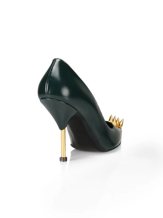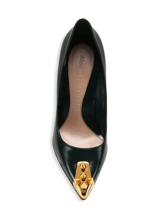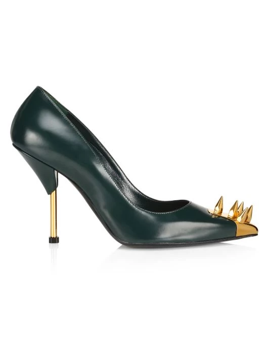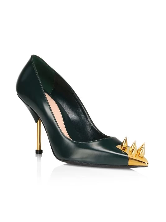 Embellished with goldtone brass spikes at the toe and a metal pin heel, these sleek leather pumps add a touch of excitement to any outfit.