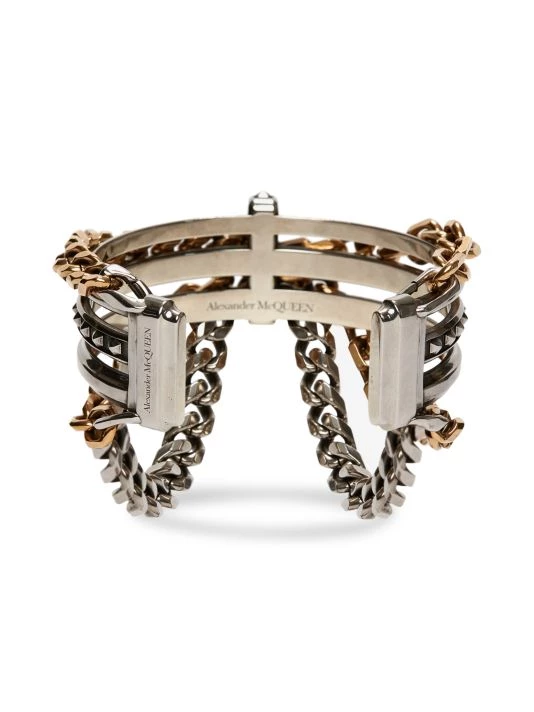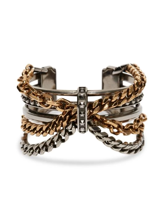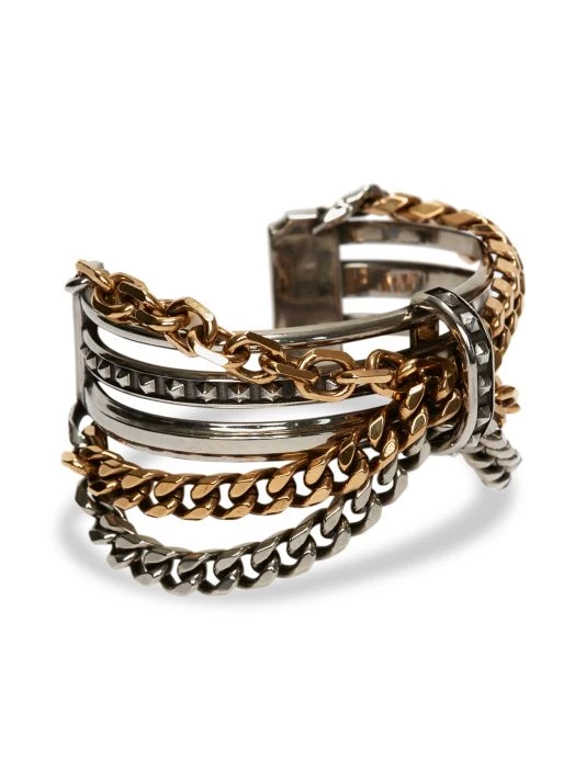 This striking cuff gleams with dangling antiqued goldtone and silvertone curb chains and pyramid studs.