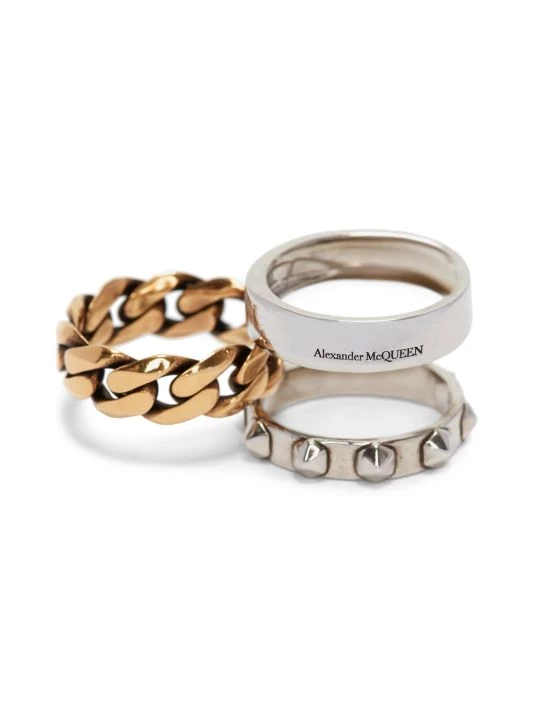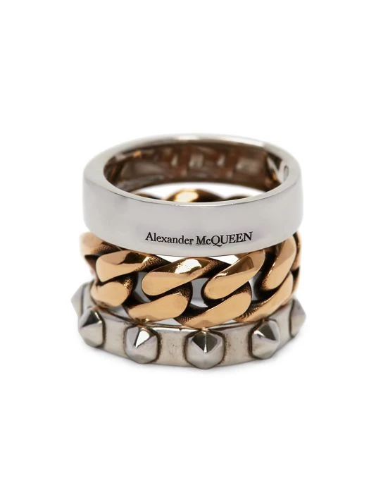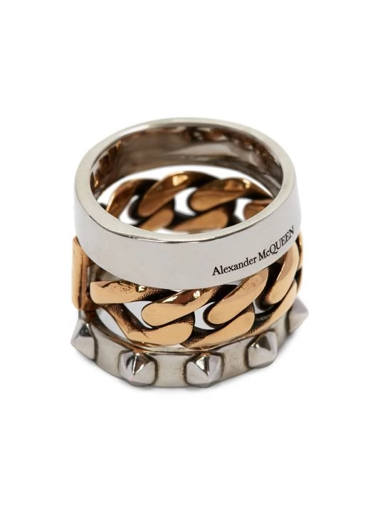 Designed with a convertible shape, this two-tone ring features studded details and polished curb chain.