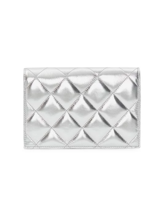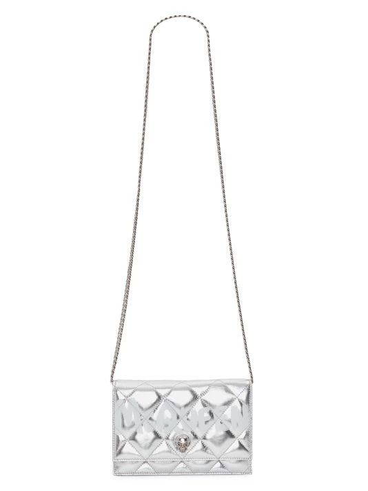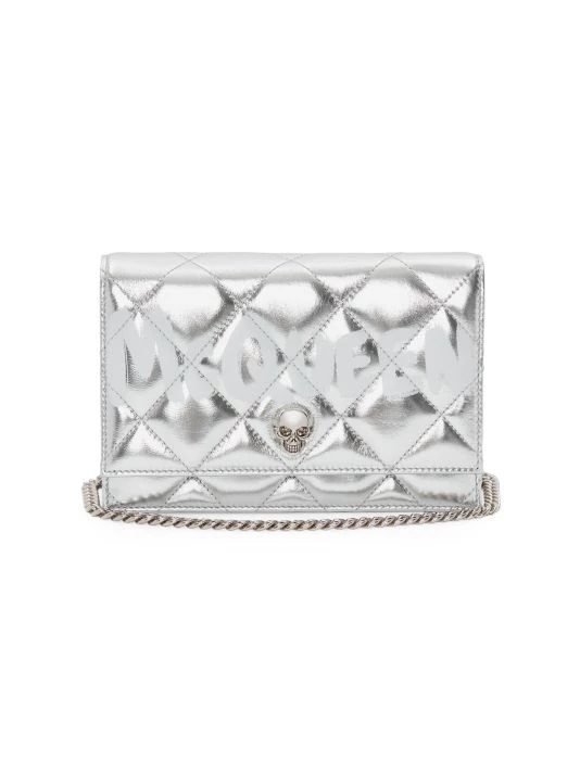 Made in Italy, Alexander McQueen’s shoulder bag is crafted of quilted metallic leather with a signature skull plaque.