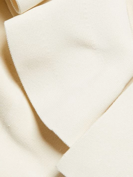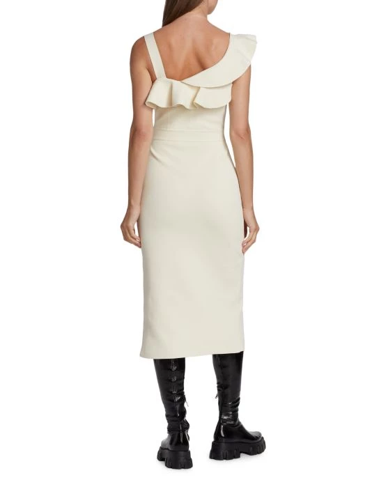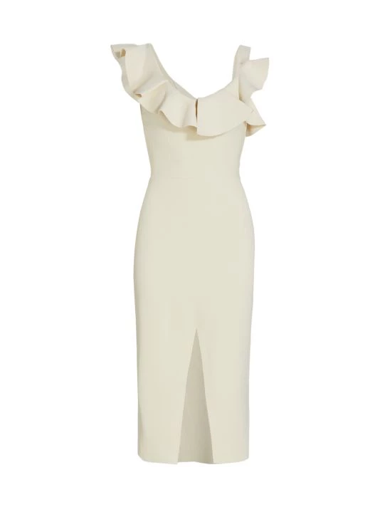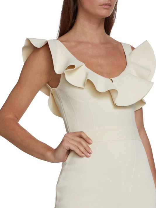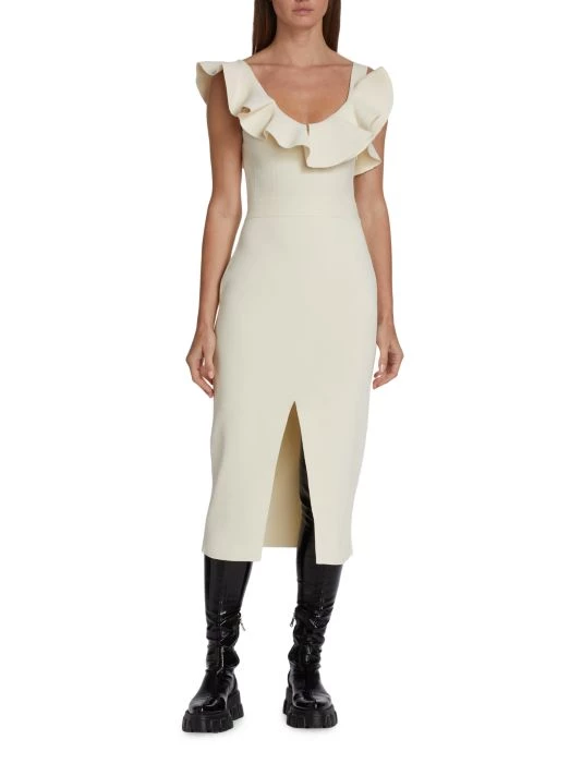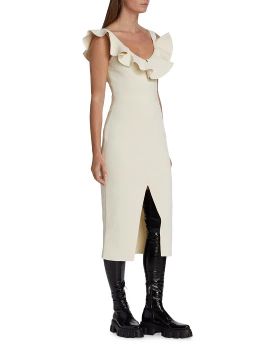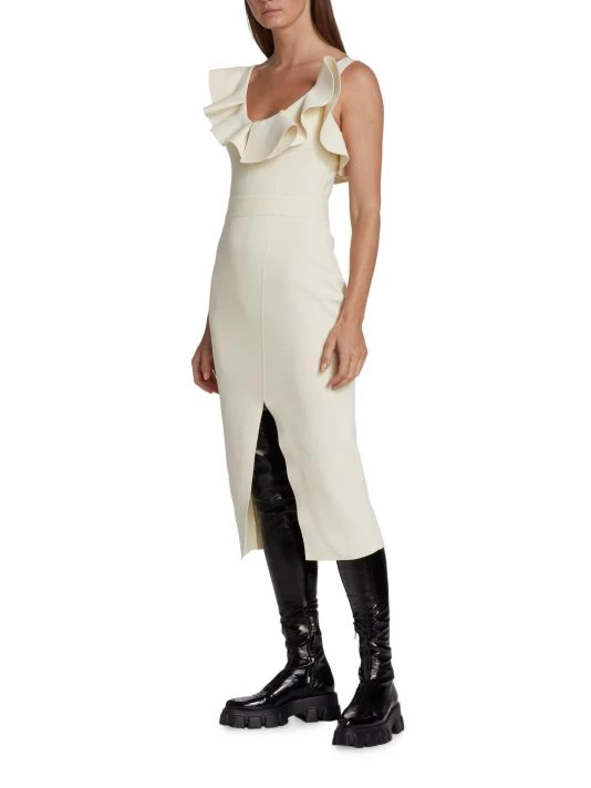 Cut with a figure-flattering body-con silhouette, Alexander McQueen’s sleeveless midi-dress is styled with a ruffled scoopneck and front slit.