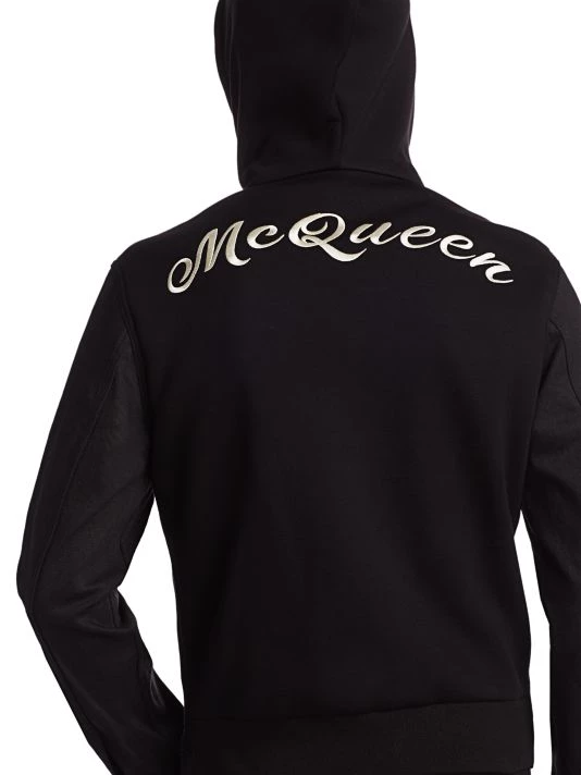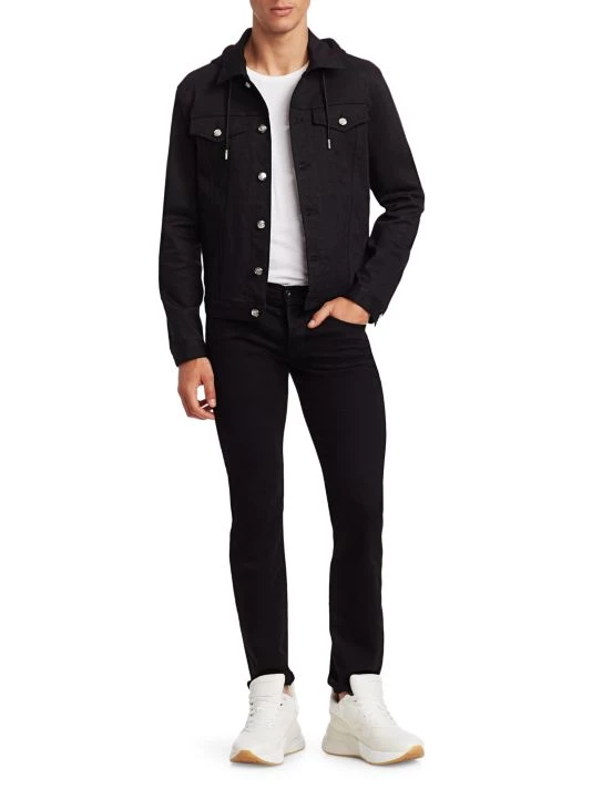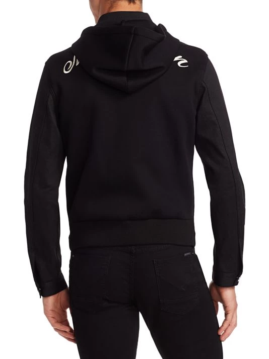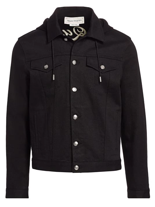 This classic denim jean jacket fused with a branded scuba hoodie looks cool from any angle.