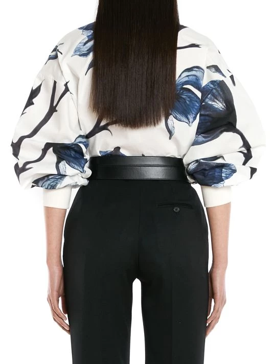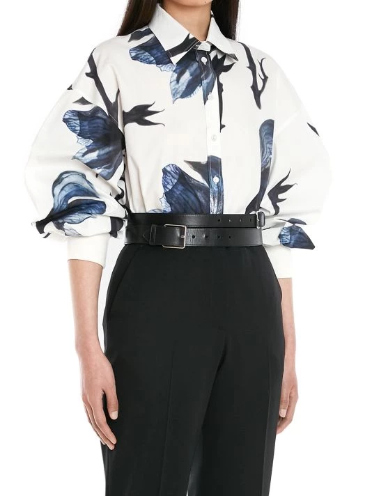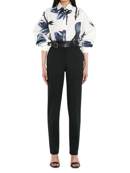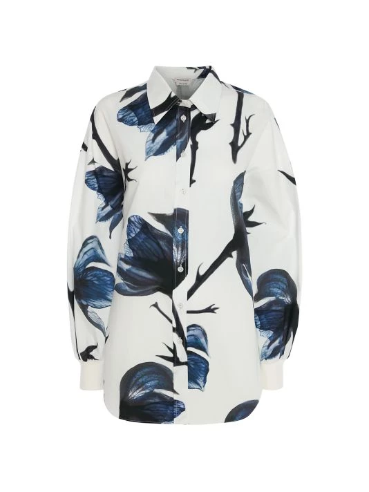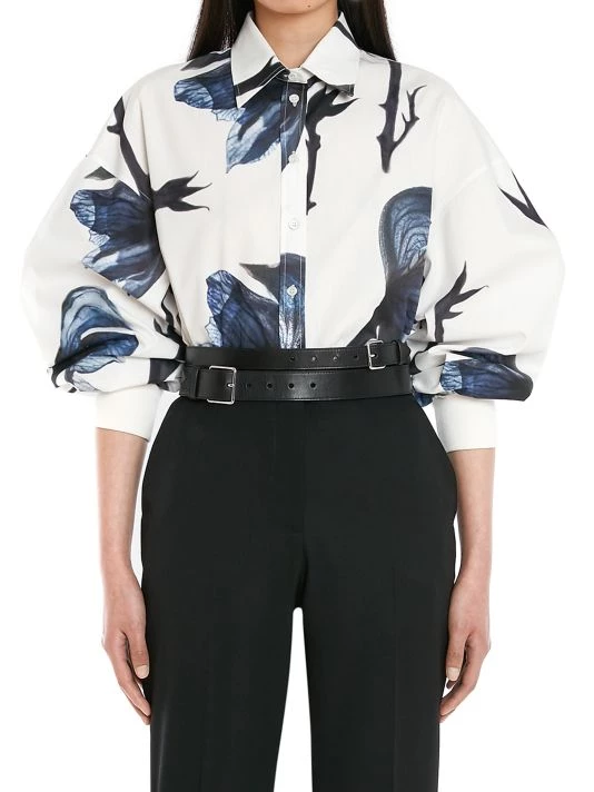 Alexander McQueen’s tailored shirt is crafted of luxurious Italian silk, featuring oversized florals and a crisp point collar.