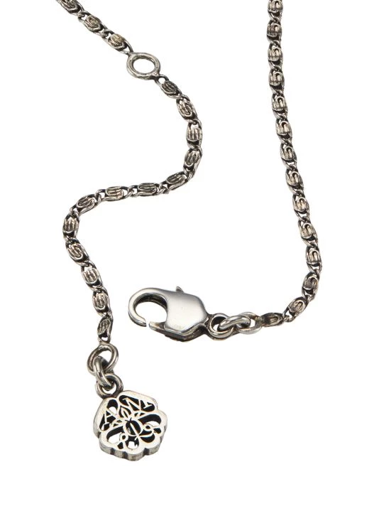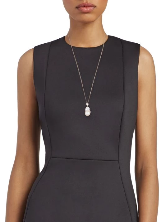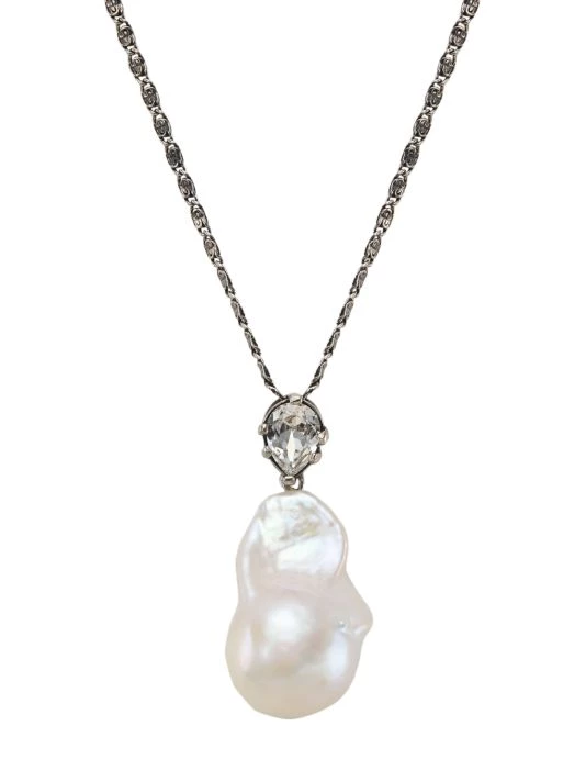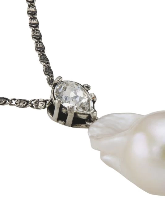 Crafted of antiqued silvertone metal, Alexander McQueen’s necklace features a luminous white baroque pearl pendant suspended from a sparkling pear-shaped crystal bail.