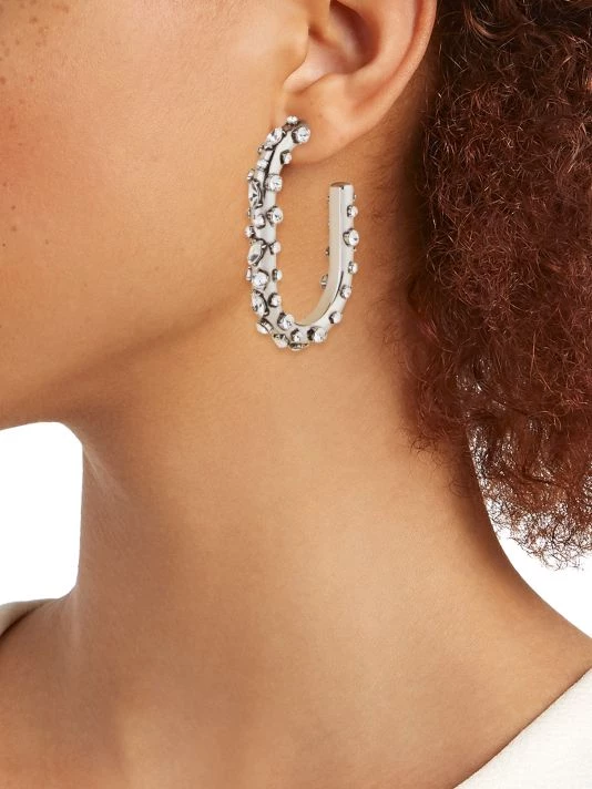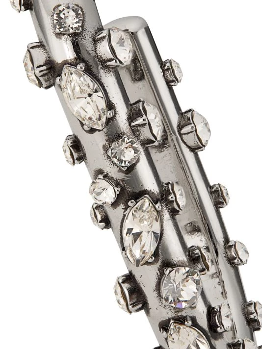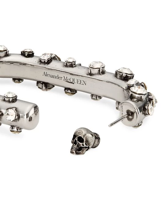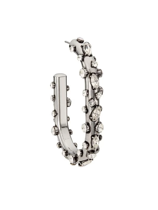 Alexander McQueen’s oval hoop earring is crafted of antiqued silvertone metal studded with crystals in a variety of cuts, sizes, and shapes. Made in Italy, this sparkling accessory secures with a post back.