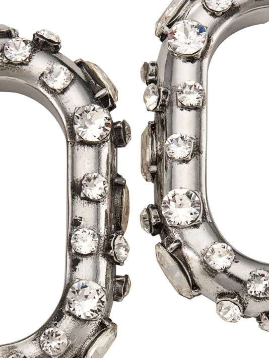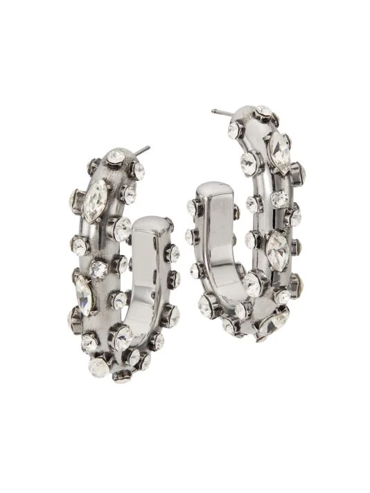 Alexander McQueen’s oval hoop earrings are crafted of antiqued silvertone metal studded with crystals in a variety of cuts, sizes, and shapes. Made in Italy, this sparkling pair secures with a post back.