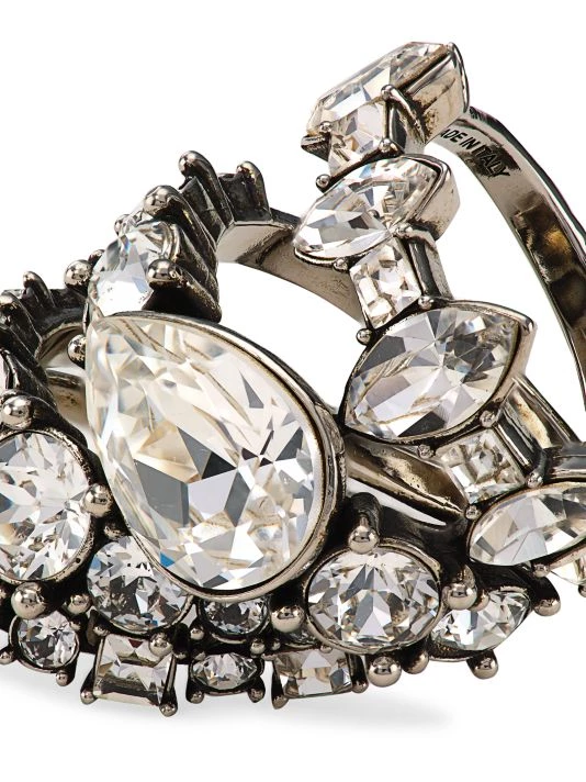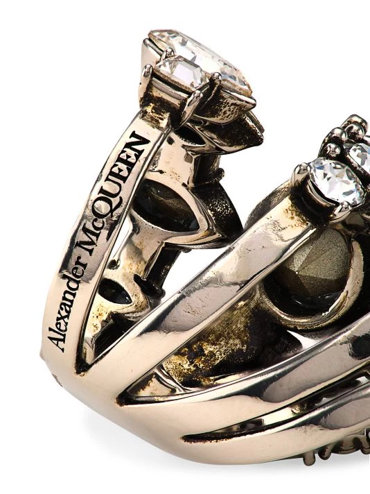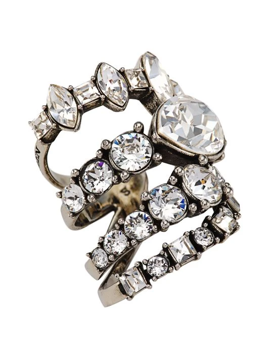 Crafted of antiqued silvertone metal, Alexander McQueen’s stacked band ring is embellished with sparkling white crystals in a variety of cuts, sizes, and shapes. This chic piece captures the label’s bold, edgy aesthetic.