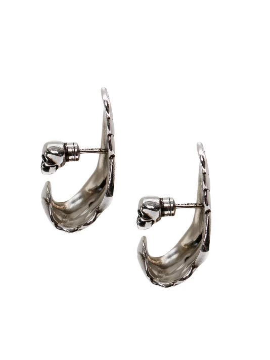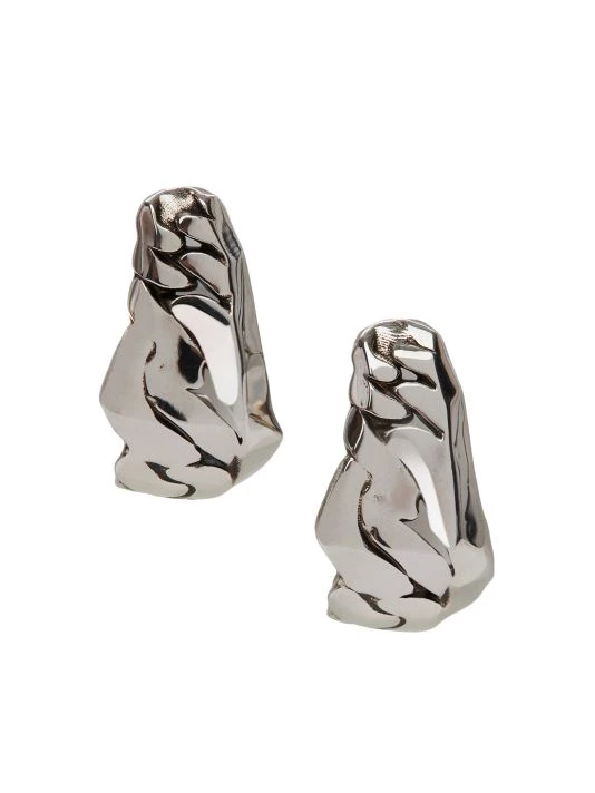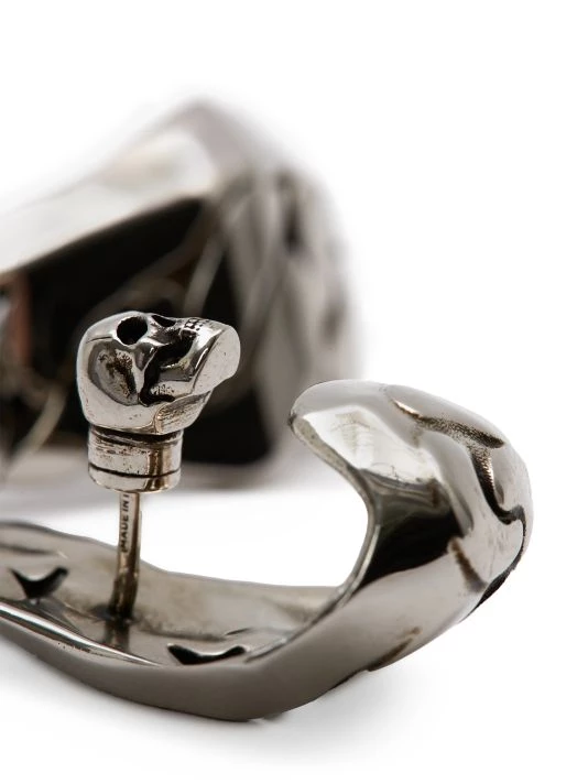 Showcasing a crushed-chain silhouette, Alexander McQueen’s hoop earrings are crafted of polished silvertone metal. This chic pair secures with a post back sculpted in the shape of the British designer’s signature skull motif.