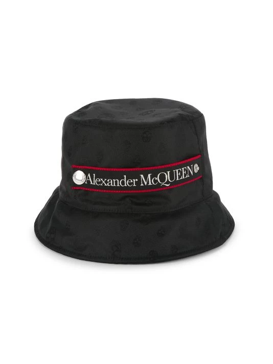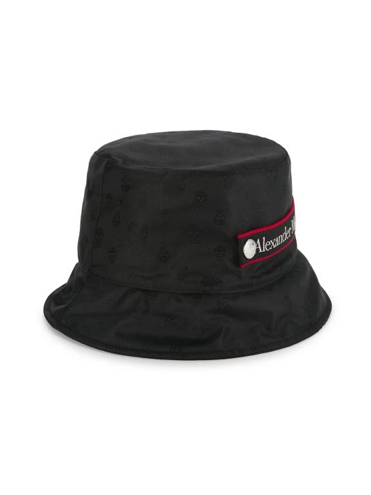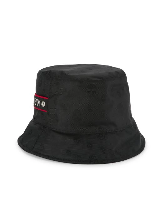 Woven bucket hat with signature skull print all over and logo tape accent.
