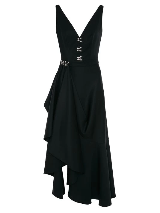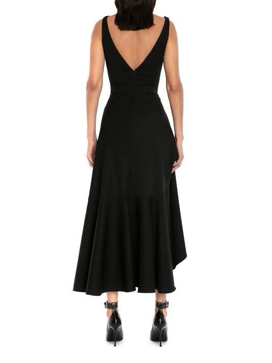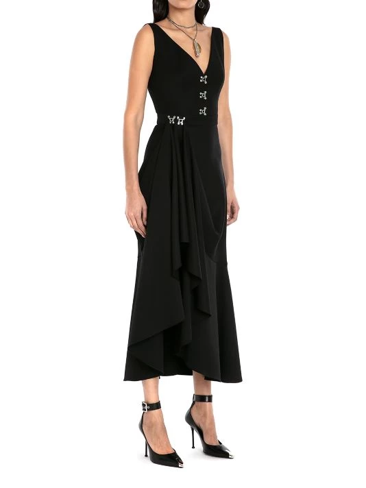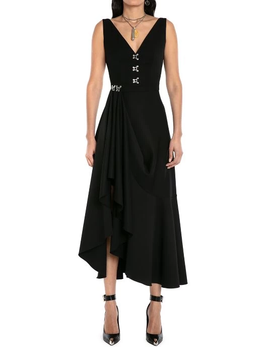 This dramatic midi-dress from Alexander McQueen drapes elegantly from the sharp V-neck, adorned with silvertone hooks at the bodice and waist.