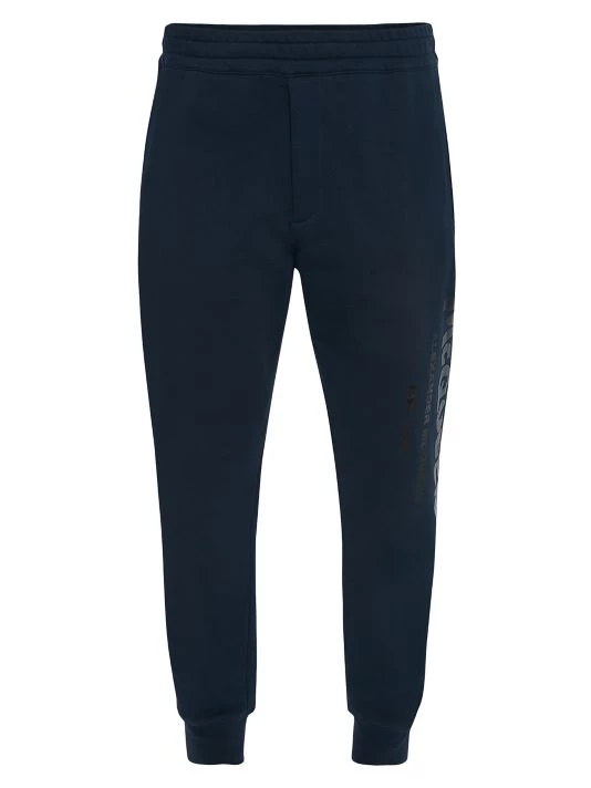 Inspired by London skies, this Alexander McQueen collection features cloud prints on linen, wool, and silk designs. Each piece encompasses casual and formal wear, from structured blazers to crewneck sweatshirts and spiked leather loafers, staying true to the brand’s slim-fit silhouettes. A tonal logo adorns the leg of Alexander McQueen’s slim cotton joggers.