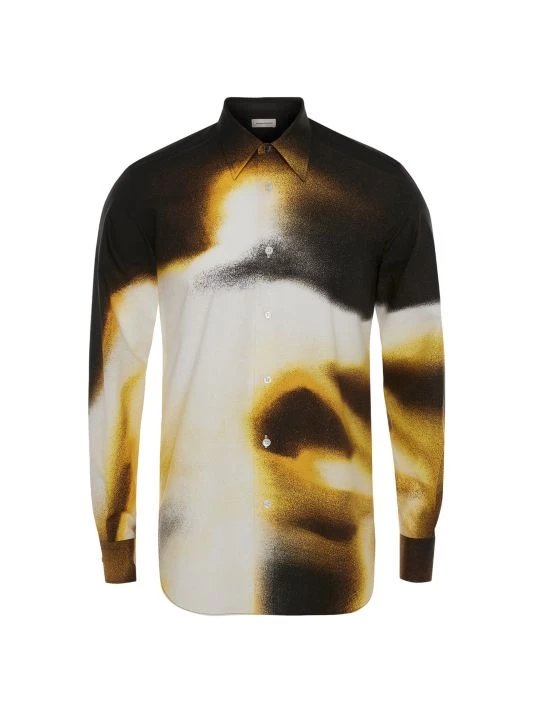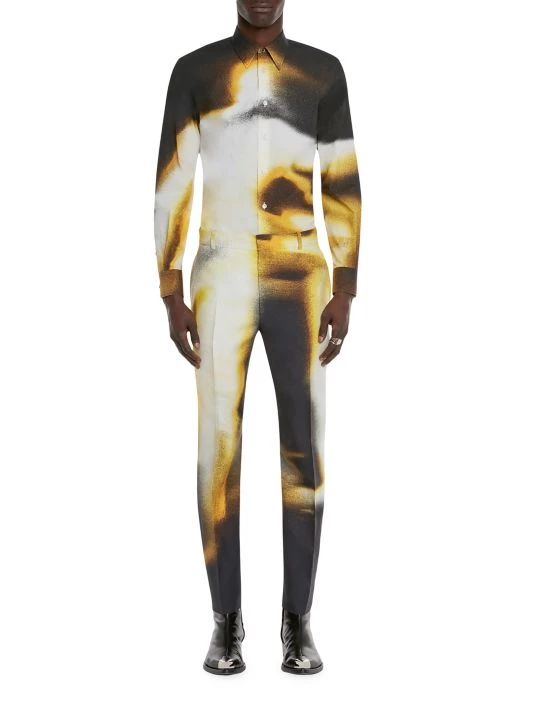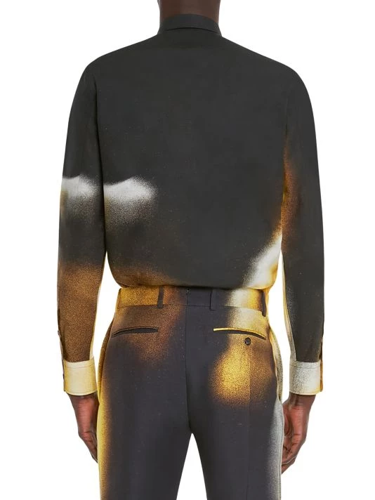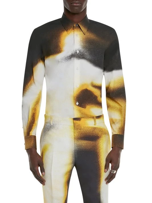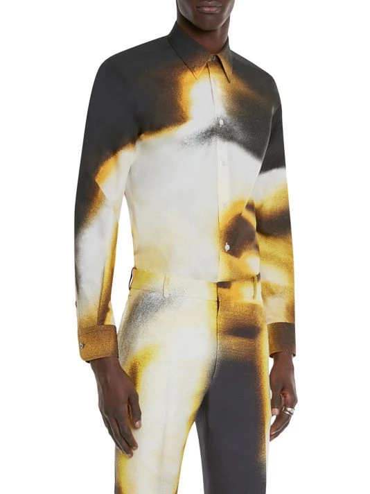Inspired by London skies, this Alexander McQueen collection features cloud prints on linen, wool, and silk designs. Each piece encompasses casual and formal wear, from structured blazers to crewneck sweatshirts and spiked leather loafers, staying true to the brand’s slim-fit silhouettes. Crafted in Italy, this slim-fit shirt is constructed in a classically Alexander McQueen house code of a tailored silhouette. A spray paint-inspired design highlights this button-up.