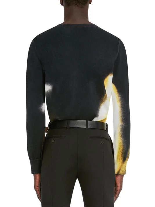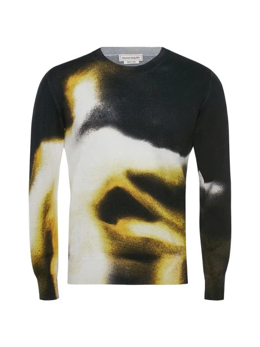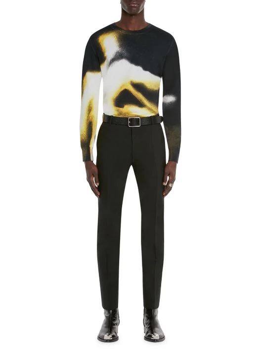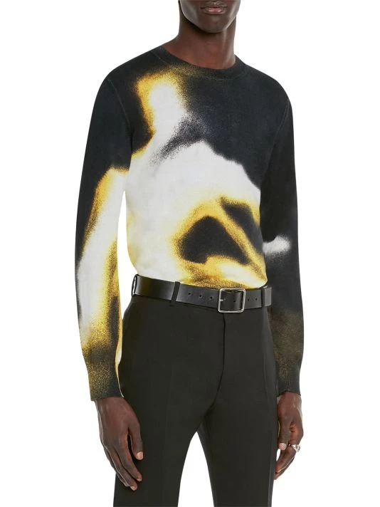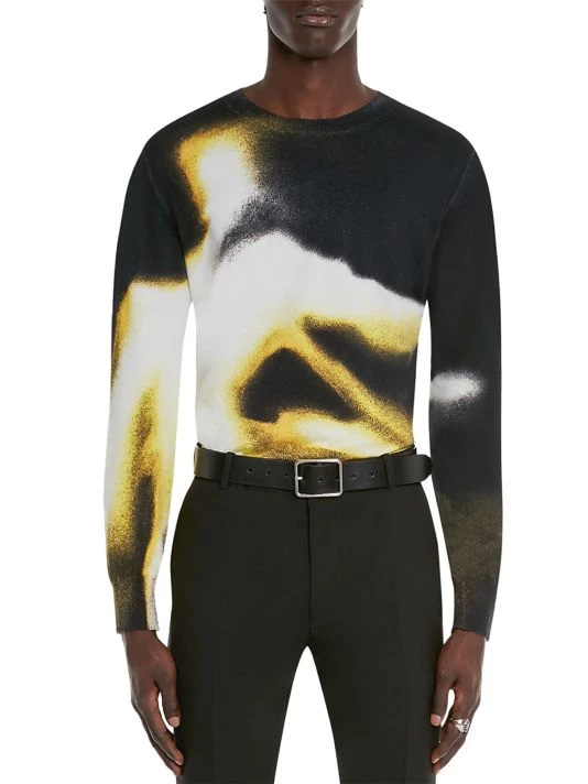 Inspired by London skies, this Alexander McQueen collection features cloud prints on linen, wool, and silk designs. Each piece encompasses casual and formal wear, from structured blazers to crewneck sweatshirts and spiked leather loafers, staying true to the brand’s slim-fit silhouettes. Crafted in Italy, this lightweight wool sweater showcases a spray paint-inspired design.