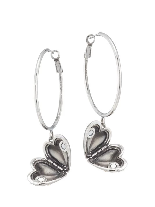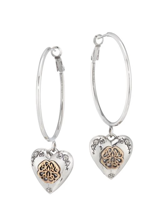 Antique silvertone hoops feature heart locket charms finished with the iconic Alexander McQueen floral seal signature in a contrasting finish and Swarovski crystal trim.