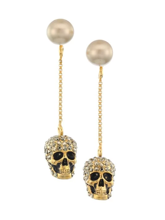 Decadent drop earrings sculpted into the shape of skulls exude edge and glamour.
