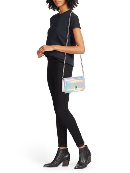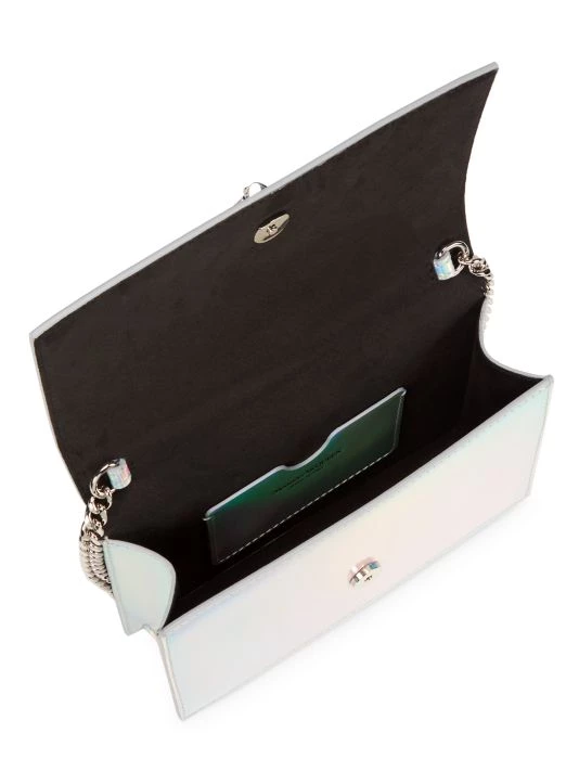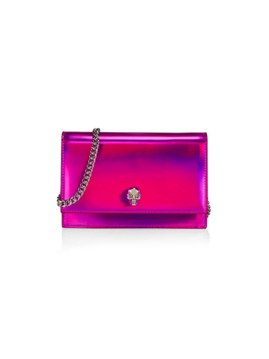 Made in Italy, Alexander McQueen’s bag is crafted of gleaming iridescent leather adorned with iconic skull hardware. This piece is accompanied by a sleek chain strap for hands-free ease.