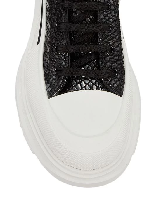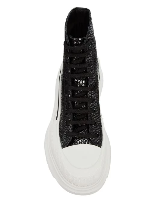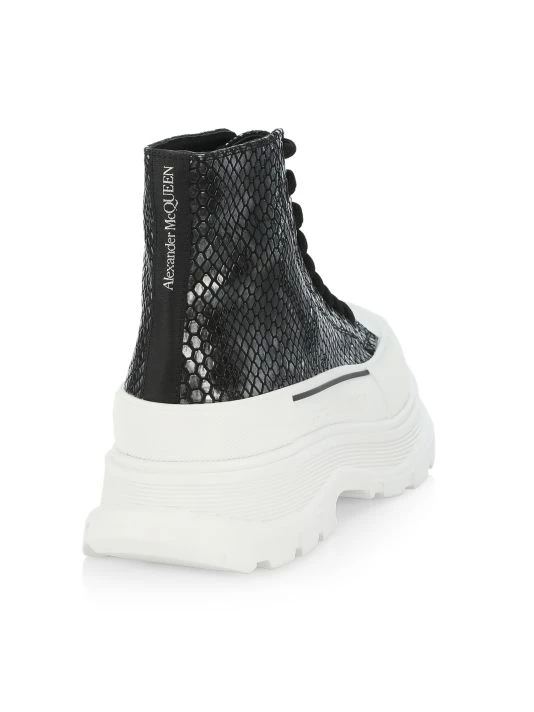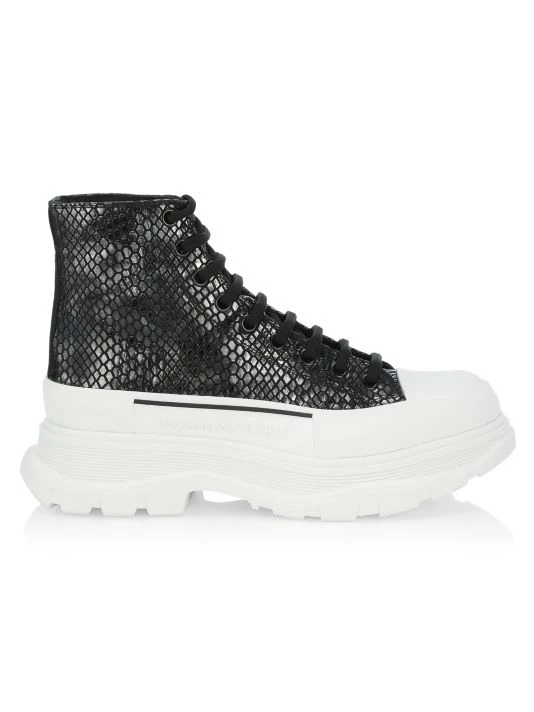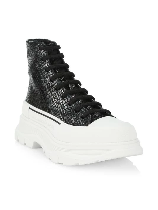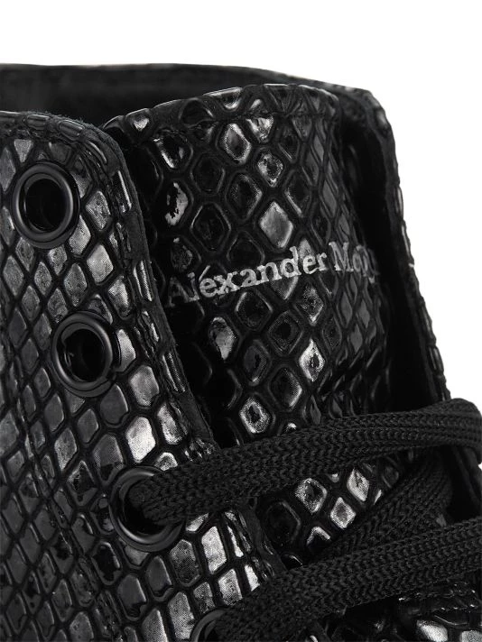 Straying from rebellious roots and offering a more romantic line, this collection was inspired by the works of English poet and painter William Blake. These platform high-top boots by Alexander McQueen feature an exciting stamped snakeskin print on the leather uppers.