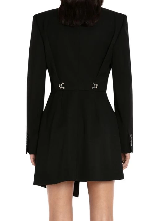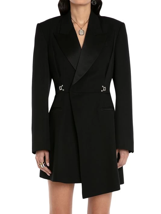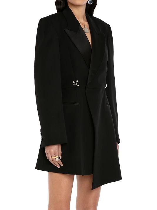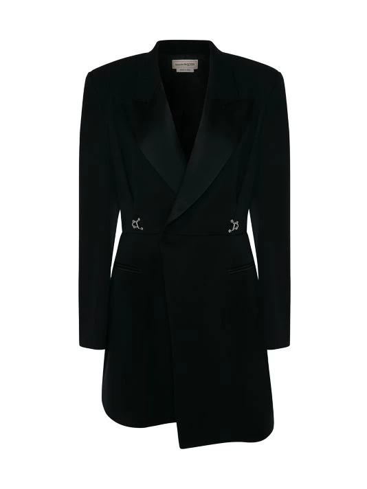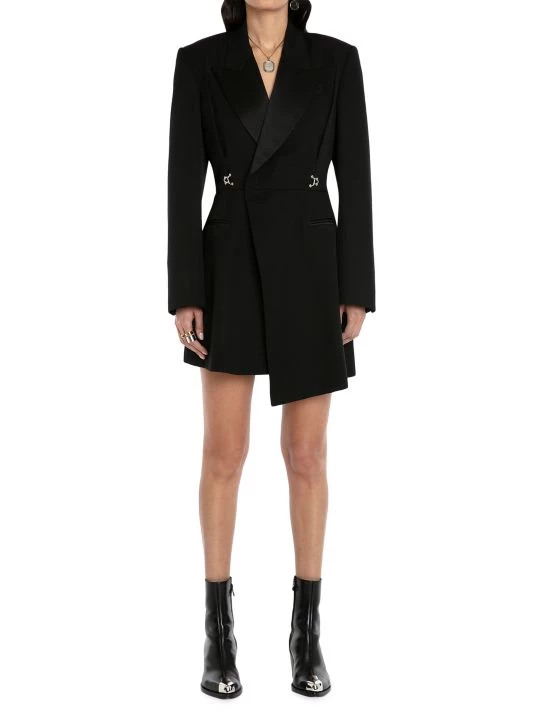 This sleek Alexander McQueen minidress is inspired by a classic menswear blazer, adorned with an asymmetric hem and silvertone hardware.