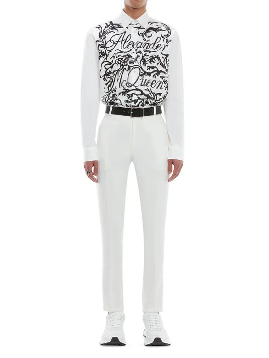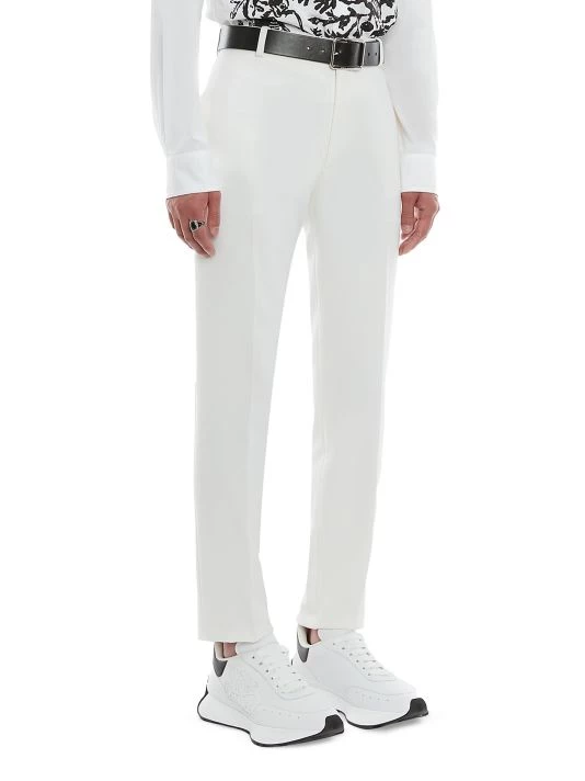 Straying from rebellious roots and offering a more romantic line, this collection was inspired by the works of English poet and painter William Blake. These wool pants feature a flat front and zip fly with hook closure.