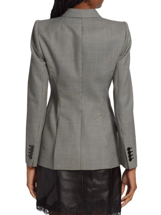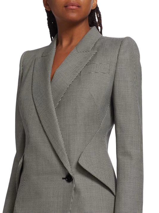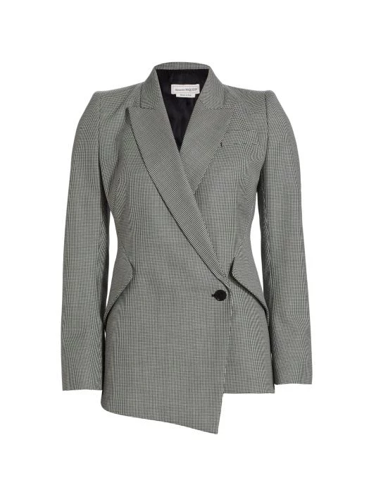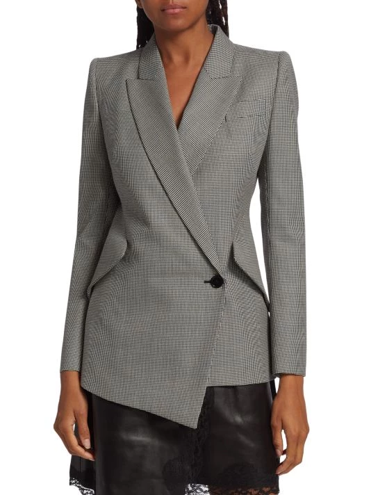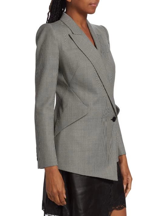 Crafted of wool with a houndstooth pattern, this Alexander McQueen jacket is designed with an asymmetric silhouette.